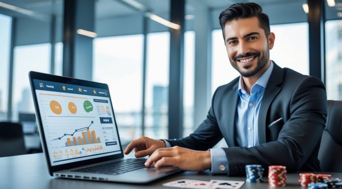 Seorang pria bisnis percaya diri di kantor modern dengan laptop, menunjukkan suasana profesional dan dapat dipercaya dalam layanan taruhan online.