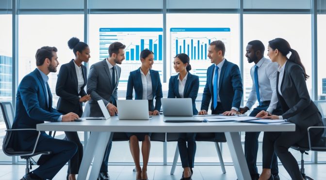 Sekelompok profesional bisnis sedang berdiskusi di sekitar meja kantor modern dengan laptop dan dokumen.