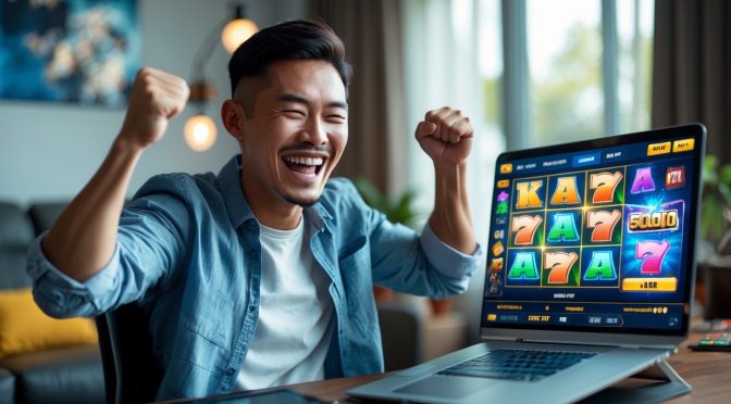 Seorang pria muda Indonesia sedang merayakan kemenangan besar saat bermain permainan slot online di laptop di rumah.