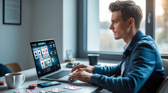 Seorang dewasa muda sedang bermain poker online di laptop dengan chip poker dan kartu di meja dalam ruangan yang terang dan rapi.