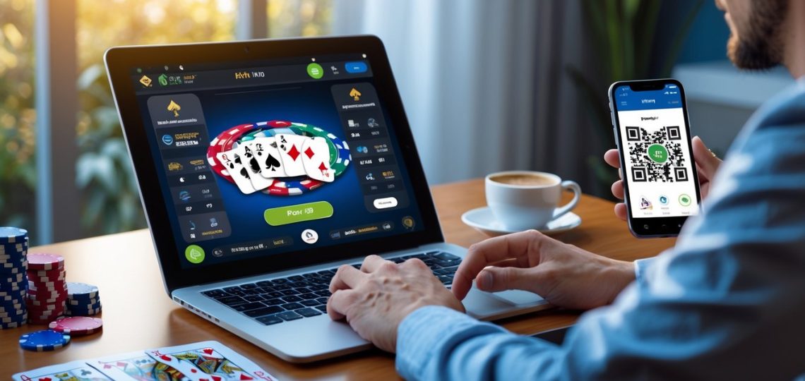 Seorang pemain poker online menggunakan laptop dengan tampilan permainan poker dan ponsel menampilkan kode QR di meja yang rapi dan terang.