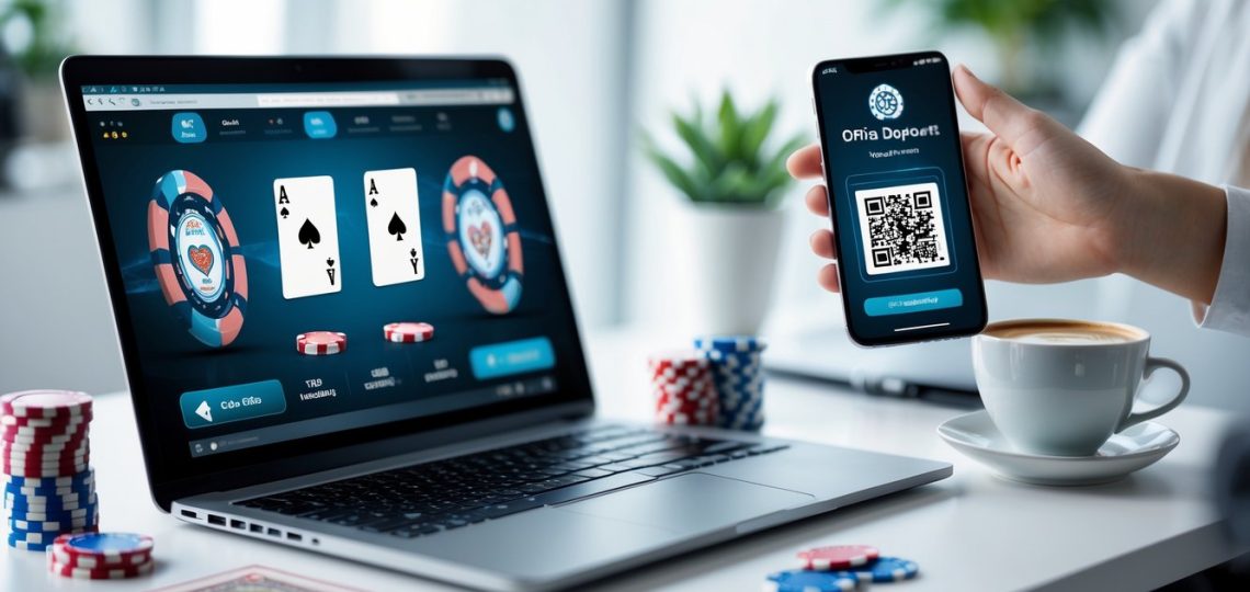 Seorang pengguna sedang bermain poker online di laptop dengan ponsel memindai kode QR untuk melakukan deposit.
